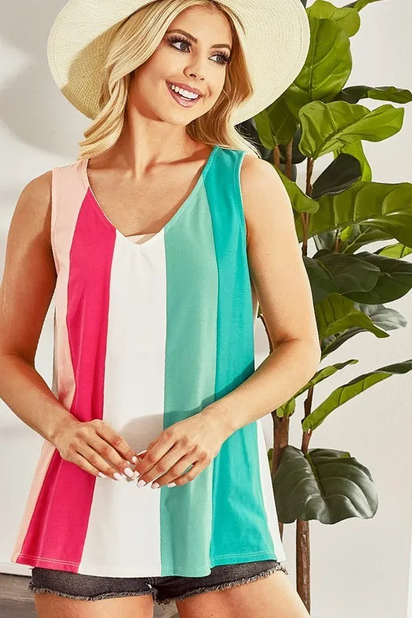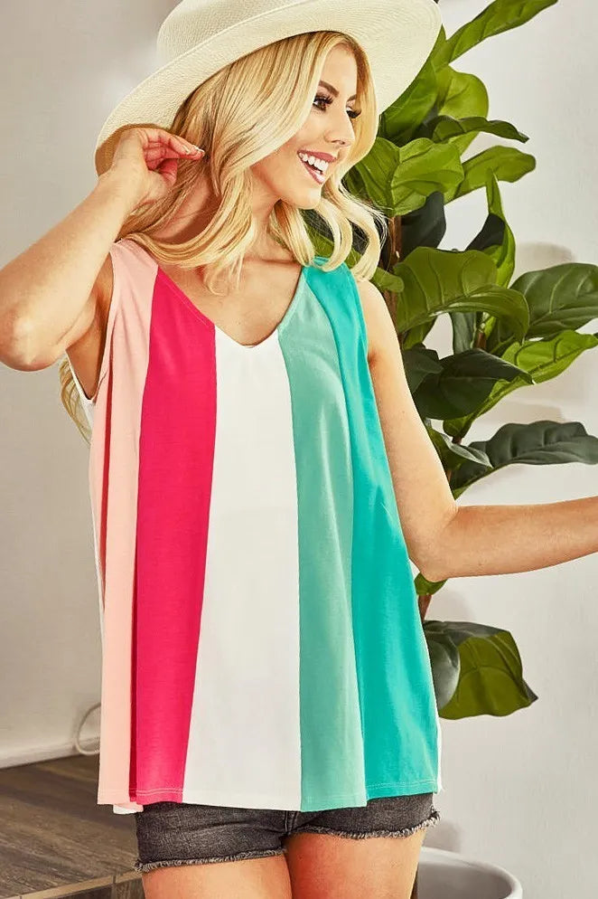 The cotton span knit color block sleeveless top is a versatile and trendy addition to your wardrobe. The color block design adds a modern and stylish touch to this top. Made from cotton span knit fabric, it offers a comfortable and breathable feel. Pair it with jeans or shorts for a chic and casual outfit. Embrace the contemporary and chic style of this cotton span knit color block sleeveless top for a fashionable and eye-catching look.